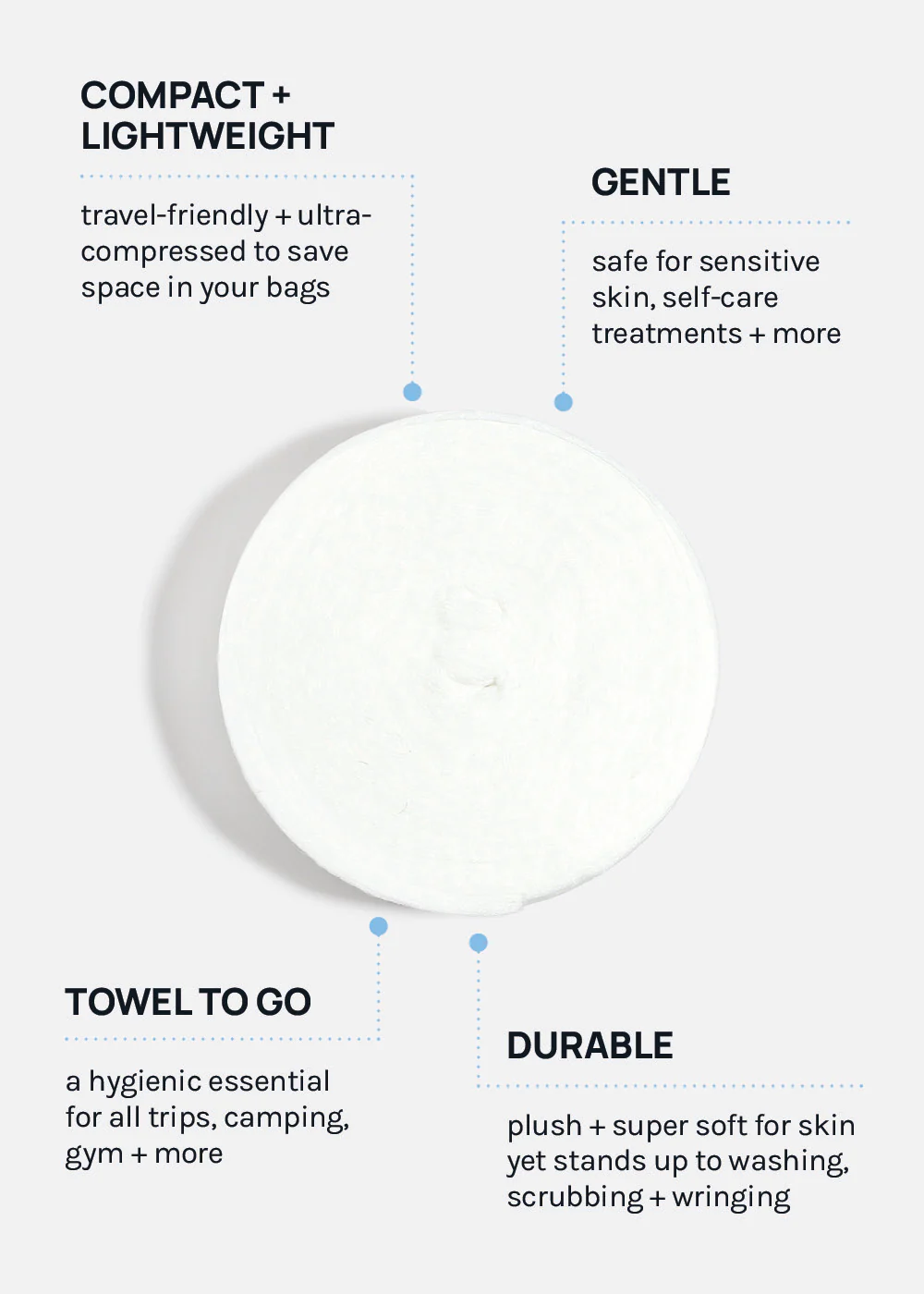 Perfect for travel, gym sessions, beach days, waterparks, camping, + more, this compact and lightweight towel is designed for ultimate portability. Simply soak to expand, wring out excess water, + hang to air-dry for repeated use. Its space-saving design makes it an essential for travelers, adventurers, + everyday users looking for a quick-drying, hygienic solution.